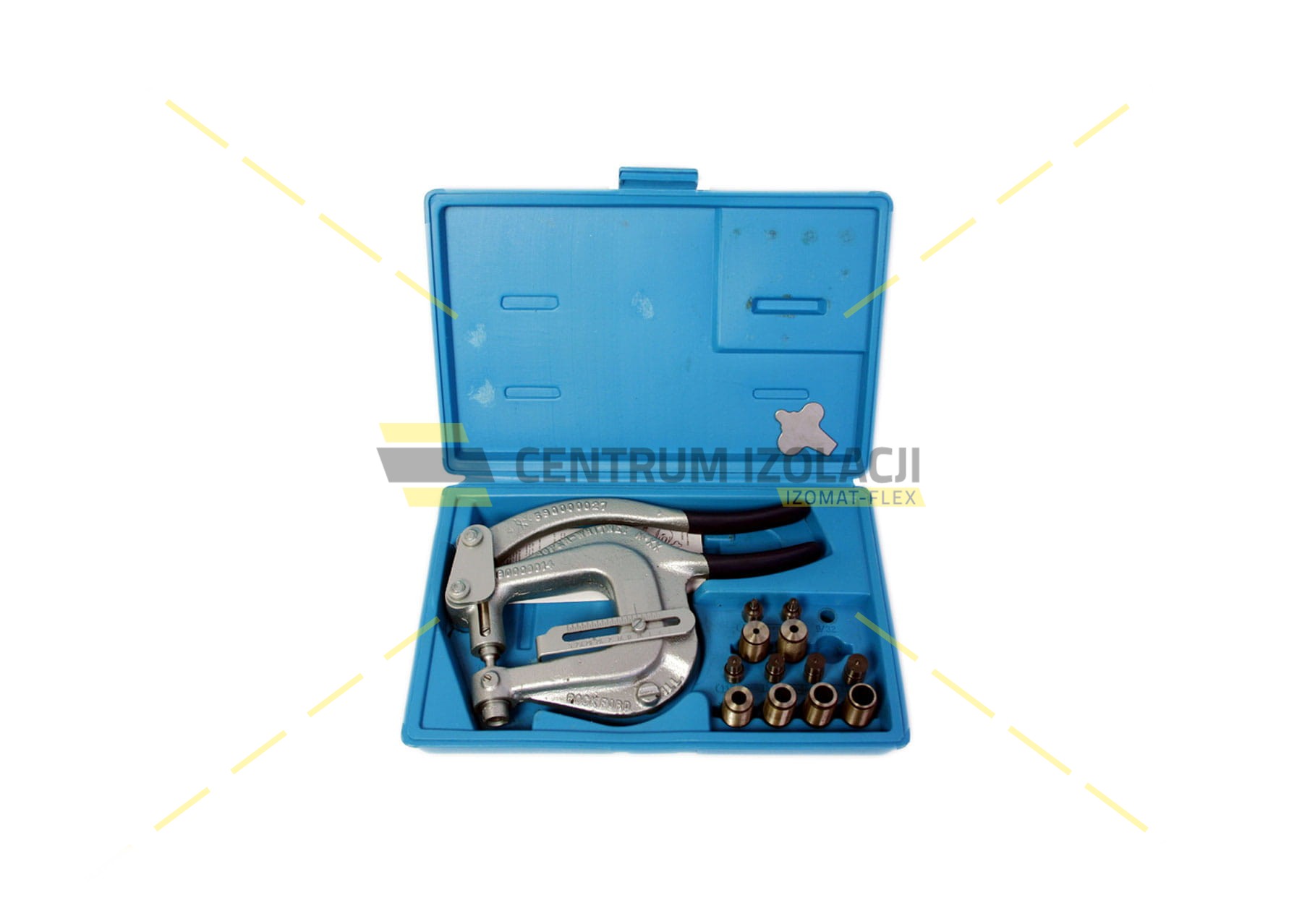Sztanca ręczna. Posiada stęple i matryce o dużej średnicy:
